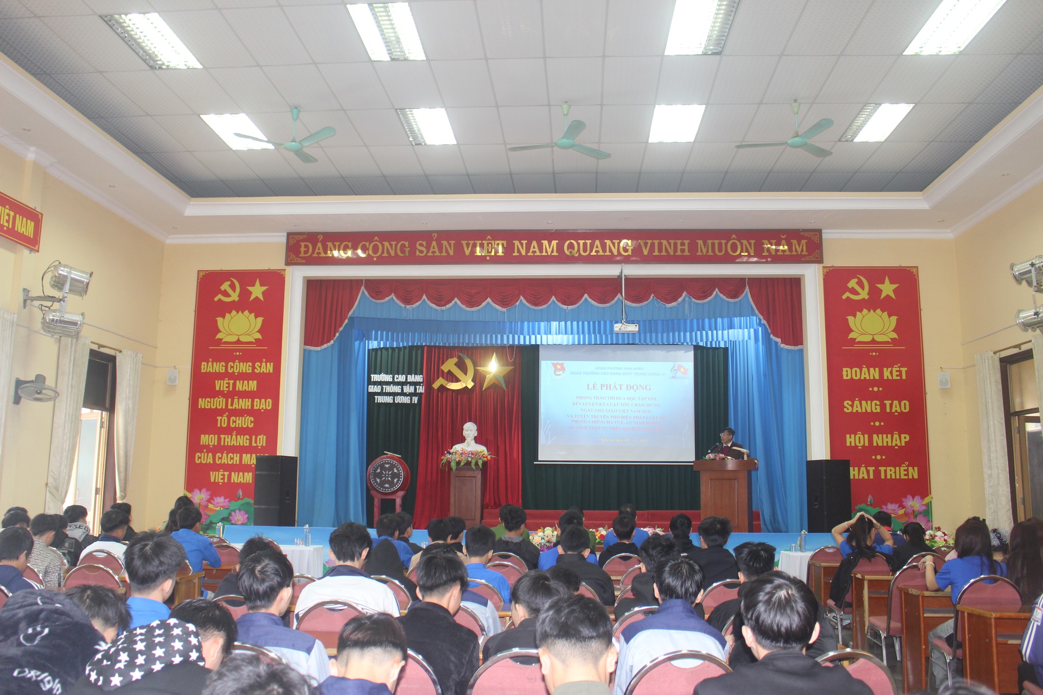 Sáng ngày 04/11/2025, Trường Cao đẳng Giao thông vận tải Trung ương IV phối hợp cùng Công an Phường Vinh Hưng tổ chức Lễ phát động phong trào thi đua học tập tốt, rèn luyện kỷ luật tốt, chào mừng Ngày Nhà giáo Việt Nam 20/11 và tuyên truyền, phổ biến pháp luật về phòng chống ma túy, an ninh mạng, phòng chống các hành vi vi phạm pháp luật về pháo nổ.